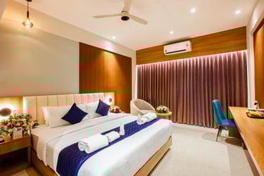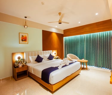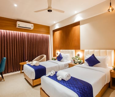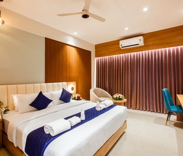 Designed with a balance of modern aesthetics and functional elegance, our Deluxe Rooms offer enhanced space and superior furnishings—ideal for travellers who enjoy an elevated stay experience. With contemporary décor, cosy bedding, and thoughtful in-room amenities, these rooms ensure a relaxed and comfortable stay throughout your visit.